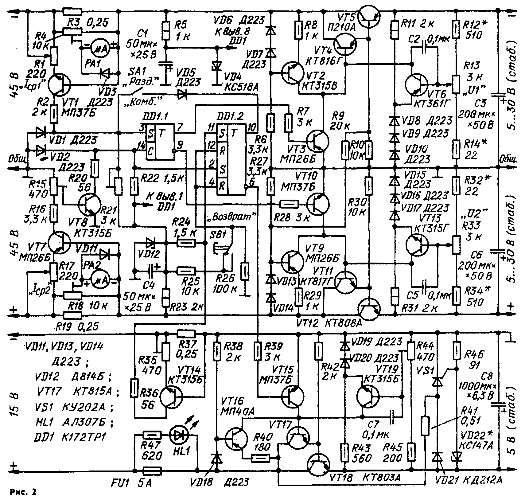 При создании домашней лаборатории радиолюбители сталкиваются с проблемой изготовления лабораторного блока питания. Многие уже имеют подобное устройство, но оно часто не устраивает владельцев из-за ограниченных эксплуатационных возможностей, в частности отсутствия или малой эффективности системы защиты от перегрузки и замыкания цепи выхода. Основные требования, которые радиолюбители предъявляют к лабораторным блокам питания, - это возможность широкого регулирования выходного стабильного напряжения, практически от нуля до 30... 35 В, способность обеспечить большой (до 3 А) ток в нагрузке при минимальной пульсации выходного напряжения, возможность питания нагрузки двуполярным выходным напряжением, а также наличие эффективной системы защиты, предотвращающей выход из строя как самого устройство, так и налаживаемой конструкции. Система должна быть быстродействующей, с «триг-герным эффектом» и одновременным отключением обоих плеч двуполярного стабилизатора. Часто бывает желательна возможность плавного или ступенчатого регулирования тока срабатывания системы защиты. Учитывая все большее распространение микросхем, питаемых от нескольких источников, в лабораторном блоке должен быть предусмотрен отдельный пятивольтовый стабилизатор, защищенный и от повышения выходного напряжения, и от замыкания на выходе. Лабораторный блок питания, описанный ниже, был разработан с учетом этих и других требований.