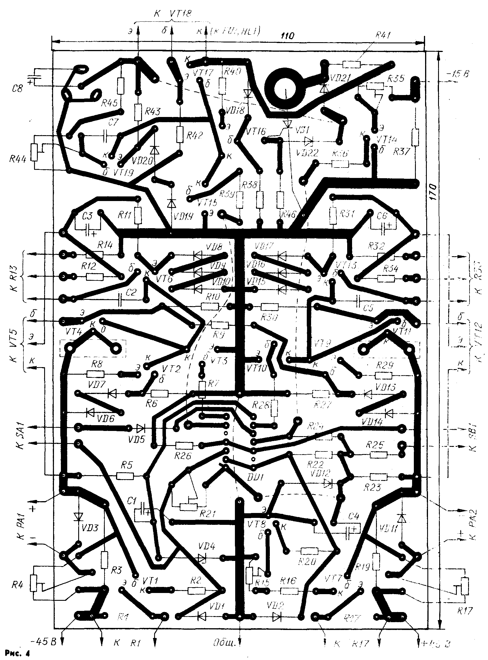 Печатная плата блока питания, чертеж которой изображен на рис. 4, выполнена из фольгированного стеклотекстолита. Для увеличения толщины дорожек печатного монтажа их необходимо облудить, а на те, через которые протекает значительный ток, следует припаять дублирующие медные проводники. На плате расположены все элементы блока, за исключением выпрямителей, регулирующих транзисторов, микроамперметров РА1, РА 2, переменных резисторов Rl, R13, R17, R33, переключателя SA1, кнопки SB1, предохранителя FU1 и резистора R47 со светодиодом HL1.