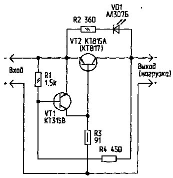 Процесс происходит лавинообразно благодаря наличию положительной обратной связи через резистор R4. В результате VT2 закрывается, и через нагрузку ток не протекает. Одновременно загорается сигнал о перегрузке. Приведенные на схеме номиналы резисторов соответствуют напряжению 9 В и току срабатывания 1 А. При необходимости изменить параметры предохранителя необходимо пересчитать величины сопротивлений R3 и R4.