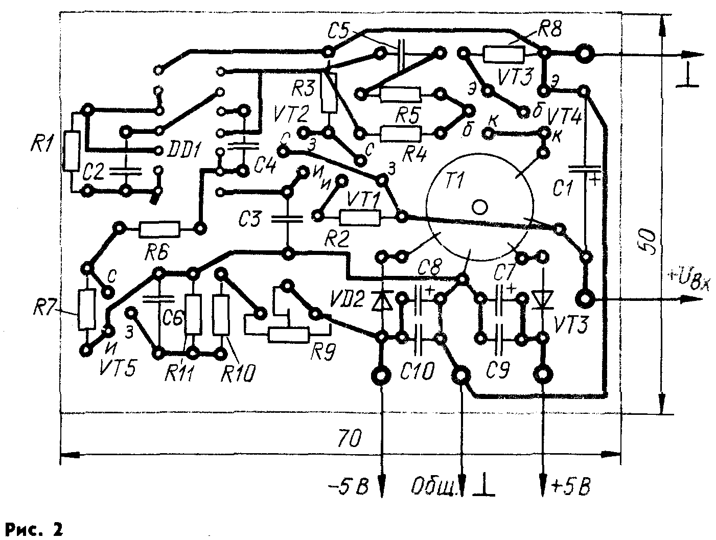 Чертеж печатной платы устройства изображен на рис. 2. Трансформатор Т1 намотан на кольцевом магнитопроводе типоразмера К12X5,5X5 из феррита М2000НМ-А. Все обмотки одинаковы и содержат по 100 витков провода ПЭВ-2 0,1. Их наматывают одновременно, в три провода. Для трансформатора подойдет и кольцо большего диаметра с примерно таким же сечением; магнитная проницаемость тоже не критична. Можно использовать и готовый импульсный трансформатор МИТ-4В. Конденсаторы С1, С9, С10 — К53-14. Транзисторы КТ3102БМ можно заменить любыми кремниевыми структуры п-р-п, а КП103Е — на КП103Ж, КП103И. Вместо транзистора КПЗ0ЗИ можно использовать КПЗ0ЗА, КПЗ0ЗБ, КПЗ0ЗЖ. Диоды Д9Б можно заменить любыми германиевыми.
