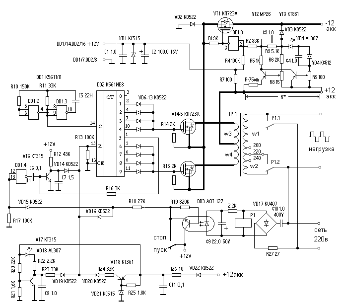 На элементах DD1.2,DD1.3 собран задающий генератор частотой 500гц. Делитель DD2 формирует две импульсные последовательности частотой 50гц с фазами, сдвинутыми на 180 градусов для управления силовыми ключами двухтактного преобразователя VT4,VT5. Чтобы избежать сквозных токов переключения между выключением одного ключа и включением другого существует мёртвая зона в 10% длительности периода. При подаче высокого уровня логическая "1" на DD2/15 (вход ,блокировки преобразователя) счётчик сбрасывается в исходное состояние, запирая оба выходных ключа. Конденсатор С7 заряжается через R12 до напряжения питания и подаёт единицу на вход блокировки через VD14. При нормальной работе преобразователя на выходе DD2/1 каждые 20мс появляется единица которая через R16 открывает транзистор VT6 разряжая С7, не давая тем самым сработать блокировке. При появлении напряжения в сети 220в открывается транзистор оптопары DD3 и блокирует преобразователь +12в через R18 и VD16 на DD2/13. Срабатывает реле Р1, подключая к сети 220в нагрузку и выходную высоковольтную обмотку силового трансформатора преобразователя, который превращается в понижающий силовой трансформатор зарядного устройства. Обратные диоды закрытых ключей VT4 и VT5 работают как выпрямительные для зарядного устройства. Зарядный ток вызывает падение напряжения на датчике тока R*(в качестве R* используется подводящий плюсовой провод аккумулятора) которым открывается транзистор VT2, подающий единицу на DD1.1/1,2. На DD1.1/3 появляется ноль, ключ VT1 отключает аккумулятор от зарядной цепи на время разряда С3. Порог срабатывания VT2 , а, следовательно, и зарядный ток выставляется потенциометром R7. Когда напряжение на аккумуляторе превысит 14в, откроется стабилитрон VD5 и током через R9 откроет VT3 и отключит аккумулятор. Потенциометром R9 выставляется напряжение на заряженном аккумуляторе (14.5-15в), которое в дальнейшем можно контролировать по свечению VD4. Ключ VT1 будет открываться только при правильном подключении аккумулятора к устройству, как в режиме заряда ,так и в режиме работы преобразователя. С целью защиты аккумулятора от глубокого разряда R21 подбирается таким образом ,чтобы при Uпит. схемы 10в транзистор VT7 уже закрылся, светодиод VD18 погас и через R22, R23, VD19 пошла единица на вход блокировки. С8 предотвращает блокировку в случае кратковременного понижения питания. VD18 является визуальным индикатором разряженности аккумулятора, при 10вольтах светодиод гаснет, при 15вольтах светит в полную силу. Для защиты выходных транзисторов от Uакк.> 15вольт током через VD21 и R25 открывается VT18 и через R24 и VD20 подаёт единицу на вход блокировки. Эта блокировка нужна для предотвращения выхода из строя силовых транзисторов. Максимальное допустимое напряжение исток-сток КП723А=60в. Во время работы преобразователя при закрытии ключей на стоках присутствуют всплески более 3Uпит. Мощность устройства ограничена мощностью силового трансформатора и максимальным допустимым током выходных транзисторов. Для силовых транзисторов нужно иметь двойной запас по току и тройной по напряжению. С использованием КП723А можно построить устройство мощностью 300ватт. Если напряжение в сети отличается от нормы , желательно сделать отводы от обмоток, как показано на рисунке. Должны соблюдаться соотношения W1/W3=14~15 , (W1+W2) / W3=23 Резистор R27-0,5вт. Все остальные мощностью 0,25вт. Силовые цепи на схеме 
