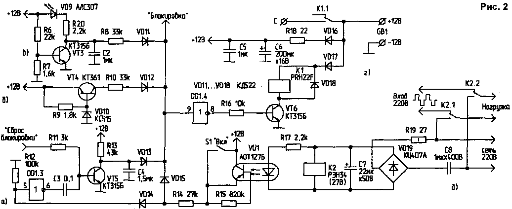 Счетчик-распределитель К561ИЕ8 (рис.1) имеет вход сброса (вывод 13), высокий уровень на котором приводит микросхему в исходное состояние. При этом прекращается счет, и все выходы, кроме нулевого (вывод 3), сбрасываются в ноль. Оба выходных транзистора VT1 и VT2 при этом закрыты, т.е. преобразователь заблокирован. Схема аварийной блокировки показана на рис.2а. Конденсатор С4 заряжается через R13 до напряжения питания при отсутствии импульсов с выхода DD1.2 и подает логическую "1" на вход блокировки (вывод 13 DD2) через VD13. При нормальной работе преобразователя, на выходе "Сброс блокировки" (вывод 1 DD2) каждые 20 мс появляется логическая "1", которая через R11 открывает транзистор VT5 и разряжает С4, не давая тем самым сработать блокировке. Защита от превышения напряжения на аккумуляторе (рис.26). При превышении Ua>15 В открывается стабилитрон VD10, током через R9 открывается VT4 и подает логическую "1" через VD12 на вход блокировки. Эта блокировка нужна для предотвращения выхода из строя силовых транзисторов. Для защиты всей схемы параллельно С5 нужно включить стабилитрон КС515. Такой ситуации не возникнет, если зарядное устройство не окажется подключенным к преобразователю без аккумулятора. Лучше преобразователь и зарядное устройство подключать к АБ разными проводами. Защита ДБ от глубокого разряда (рис.2в). Величина R7 подбирается таким образом, чтобы при Ua<10,5 В транзистор VT3 уже закрылся, светодиод VD9 погас, и через R8 и VD11 подалась логическая "1" на вход блокировки. С2 предотвращает блокировку в случае кратковременного понижения Ua. Защита от неверного включения (переполюсовки) АБ (рис.2г). При аварийной блокировке на выводе 9 DD1.4 присутствует логическая "1", на выходе DD1.4 - "О". Транзистор VT6 закрывается, реле К1 отпускает и отключает АБ от силовой части преобразователя. В случае переполюсовки при подключении АБ реле К1 вообще не срабатывает. Автомат переключения на резервное питание (рис.2д). В случае присутствия напряжения в сети, реле К2 включено, и своими контактами подключает нагрузку непосредственно к сети. Транзистор оптопары VU1 открыт, и через R14 подает логическую "1" на вход блокировки. Преобразователь при этом заблокирован. При пропадании напряжения сети отпускает реле К2, переключая нагрузку на выход преобразователя. Закрывается транзистор оптопары, и появляется логический "О" на выводе 5 DD1.3. Тоща на выходе DD1.3-"1", положительный импульс открывает транзистор VT5, разряжается С5, со входа блокировки пропадает "1", и преобразователь запускается. Выключатель S1 "Вкл" позволяет выключать преобразователь в том случае, когда при отсутствии напряжения в сети резервное питание не требуется;"+" питания поступает через выключатель S1 и R14 на вход блокировки. При размыкании контактов выключателя S1 происходит запуск преобразователя - так же как и после пропадания напряжения в сети.