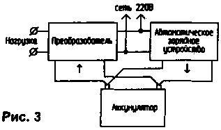 Схема преобразователя потребляет в дежурном режиме ток порядка 7 мА. Чтобы получить схему бесперебойного питания, предлагаемый преобразователь нужно дополнить автоматическим зарядным устройством (рис.3), обеспечивающим заряд и поддержание в рабочем состоянии аккумуляторной батареи (АБ). Преобразователь и зарядное устройство нужно подключать к аккумулятору отдельными проводами.