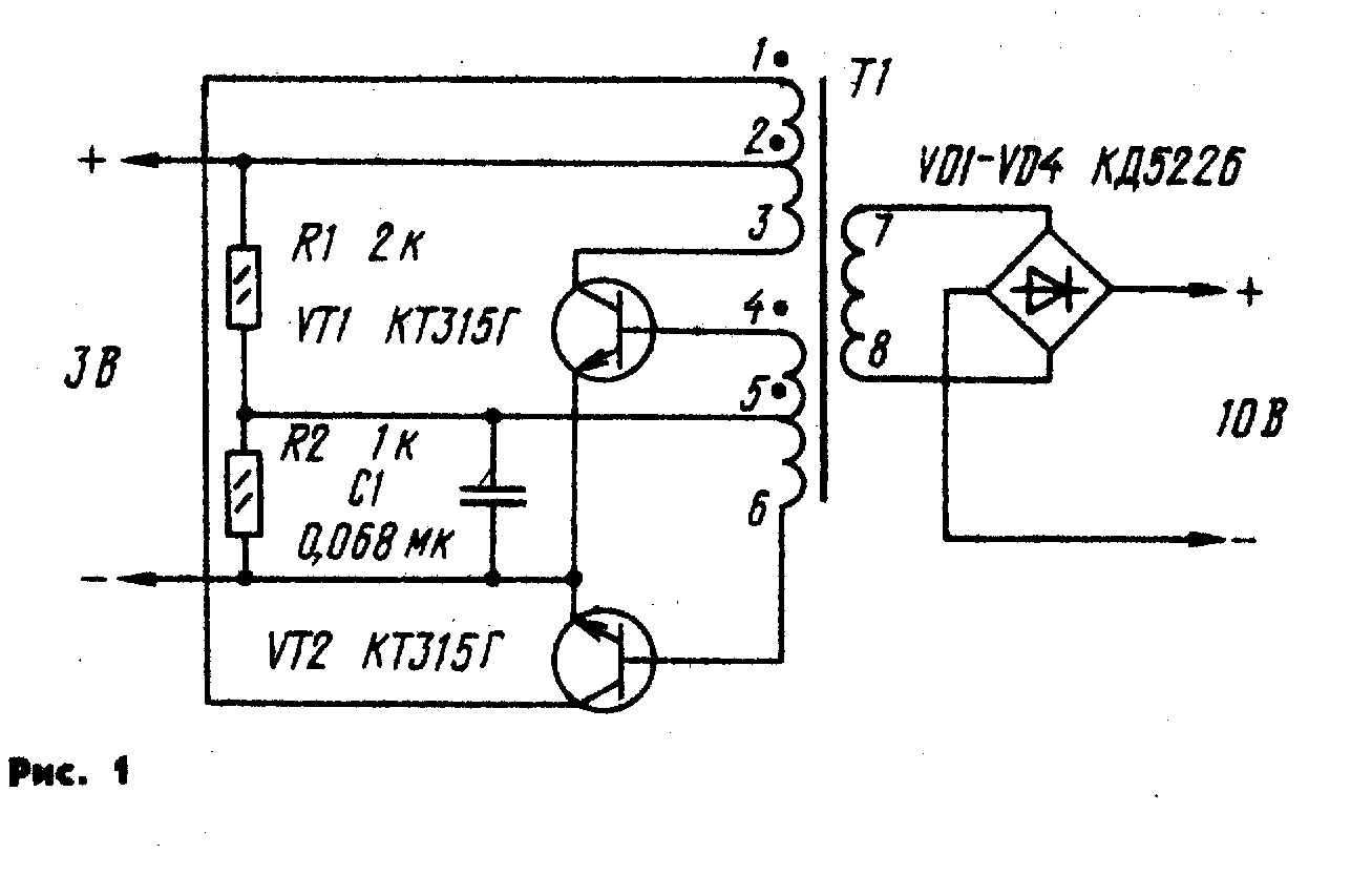 Преобразователь напряжения построен по схеме двухтактного генератора (рис. 1), что позволило получить достаточно высокий КПД. Роль переключателей выполняют транзисторы VТ1 и VТ2, которые поочередно открываются и закрываются подобно транзисторам симметричного мультивибратора. Фазировка их работы осуществлена соответствующим включением коллекторных и базовых обмоток трансформатора Т1. Делитель напряжения R2R1 обеспечивает запуск преобразователя. При включении напряжения питания падение напряжение на резисторе R2 (порядка 0,7 В) плюсом приложено к базам транзисторов и открывает их. Вследствие разброса параметров транзисторов токи коллекторов (и токи в коллекторных обмотках трансформатора Т1) не могут быть совершенно одинаковыми, а увеличение тока в одном из плеч генератора приводит к появлению положительной обратной связи на базу данного транзистора и, как следствие, лавинообразному нарастанию тока до его насыщения. При уменьшении скорости нарастания тока в коллекторной обмотке противоЭДС создает положительную связь на базу транзистора другого плеча, ток коллектора в первом плече спадает и лавинообразно увеличивается в цепи коллектора и обмотке другого транзистора. Таким образом, в магни-топроводе трансформатора наводится переменный во времени магнитный поток, который будет создавать во вторичной обмотке (выводы 7—8) ЭДС. Диодный мост VD1 — VD4 переменное напряжение преобразует в пульсирующее, а его сглаживание осуществляется элементами цепи питания усилителя воспроизведения. В устройстве преобразователя конденсатор С1 повышает надежность процесса самовозбуждения.