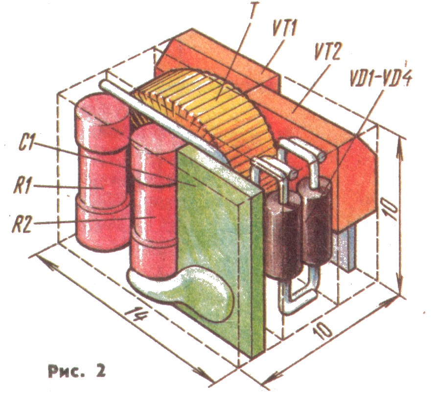 Монтаж преобразователя — любой, его детали можно расположить на одной плате с деталями усилителя или оформить в виде отдельного блока. В авторской конструкции был использован второй вариант (рис. 2). Детали преобразователя склеены между собой в объемную конструкцию, состоящую из трех слоев. Слой первый — конденсатор С1 и резисторы R1, R2. Второй — трансформатор и диодный мост, спаянный из VD1— VD4. Третий — транзисторы VТ1, VТ2, спаянные между собой выводами эмиттеров. Перед установкой транзисторов для уменьшения габаритов блока их следует сточить с боков до длины 7 мм. Выводы трансформатора припаяны прямо к выводам деталей. Остальные соединения сделаны тонкими проводниками. После этого следует припаять входные и выходные проводники и проверить работоспособность блока. При использовании исправных элементов и правильно выполненном монтаже конструкция сразу заработает. Если этого не произошло, то надо проверить правильность подключения обмоток трансформатора. После этого всю конструкцию следует залить эпоксидной смолой. Полностью изготовленный и проверенный на работоспособность блок помещают в коробочку из тонкой бумаги, предварительно в ней сделать отверстия для выводов и заполнить объем компаундом.