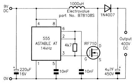 Простой, но высокоэффективный преобразователь постоянного напряжения (рис.1) Дж. Вилкинсона содержит минимум элементов, но обеспечивает несколько миллиампер тока напряжением 400...425 В при потребляемом токе 80-90 мА от источника 9 В. На таймере типа 555 выполнен мультивибратор на частоту 14 кГц. КПД устройства сильно зависит от добротности катушки индуктивностью 1 мГ.