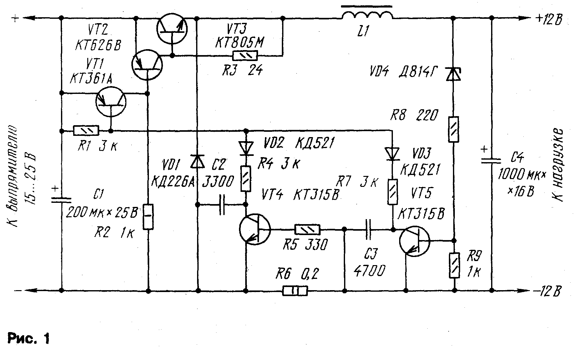 По мере уменьшения тока через дроссель и разрядки конденсатора С4 напряжение на нагрузке уменьшится, что приводит к закрыванию транзисторов VT5, VT1 и открыванию ключевого элемента. Далее процесс работы стабилизатора повторяется. Конденсатор СЗ, снижающий частоту колебательного процесса, повышает КПД стабилизатора. Более подробно о работе такого стабилизатора рассказано в [1].