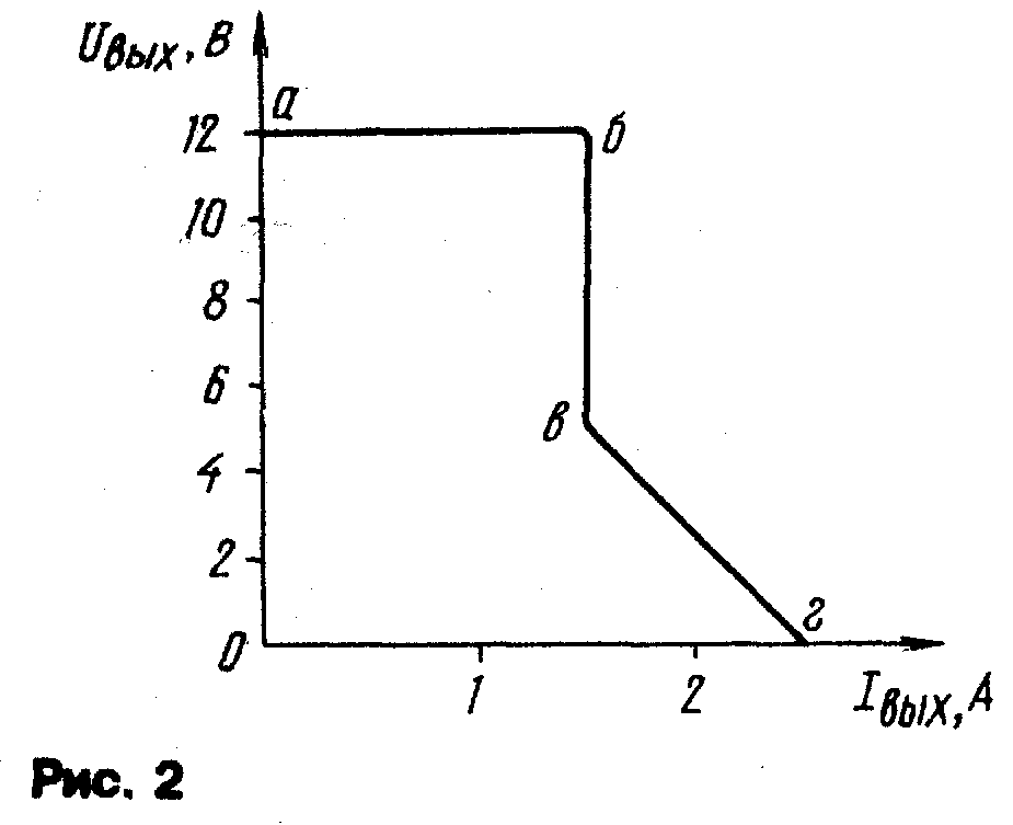 Стабилизатор несложно перестроить на другое выходное напряжение и ток, потребляемый нагрузкой. Необходимое выходное напряжение устанавливают выбором соответствующего стабилитрона VD4, а максимальный ток нагрузки — пропорциональным изменением сопротивления резистора R6 или подачей на базу транзистора VT4 небольшого тока от отдельного параметрического стабилитрона через переменный резистор. Участок б — в на нагрузочной характеристике позволяет использовать устройство для зарядки аккумуляторных батарей стабильным током. При этом, правда, КПД стабилизатора падает, и если предполагается длительная работа на этом участке нагрузочной характеристики, то транзистор VT3 придется установить на более эффективный тсп-лоотвод. Иначе допустимый выходной ток придется уменьшить. Для снижения уровня пульсаций выходного напряжения целесообразно использовать LC-фильтр, аналогичный примененному в [1].