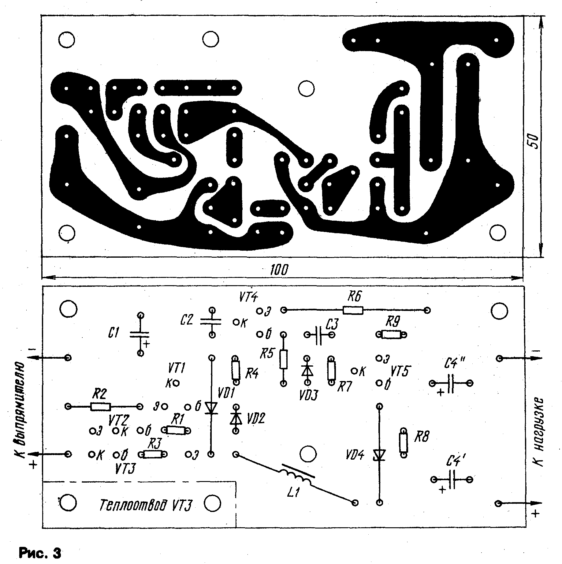 Стабилизатор выполнен на печатной плате из одностороннего фольгированного стеклотекстолита (рис. 3). Резисторы — МЛТ и С5-16Т (R6). Оксидный конденсатор С4 составлен из двух конденсаторов К50-6 емкостью по 500 мкФ каждый; конденсаторы С2 и СЗ—К10-7В. Диод КД226А (VD1) заменим на КД213; VD2 и VD3 могут быть любыми импульсными. Транзисторы VT1, VT4, VT5 — любые маломощные соответствующих структур с Uкэ max>Uвх. Транзистор VT2 (с некоторым ухудшением КПД) может быть любым из серии КТ814, VT3 — любым мощным структуры n-p-n в пластмассовом корпусе, который следует установить на теплоотводе размерами 40x25 мм из алюминиевого сплава. Дроссель L1 представляет собой 20 витков жгута из трех проводов ПЭВ-2 0,47, помещенных в чашечный магнитопровод Б22 из феррита 1500НМ3. Магнитопровод собран с зазором толщиной 0,5 мм из немагнитного материала. Безошибочно смонтированный стабилизатор налаживания не требует.