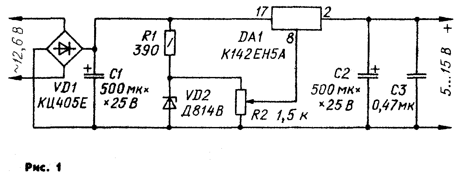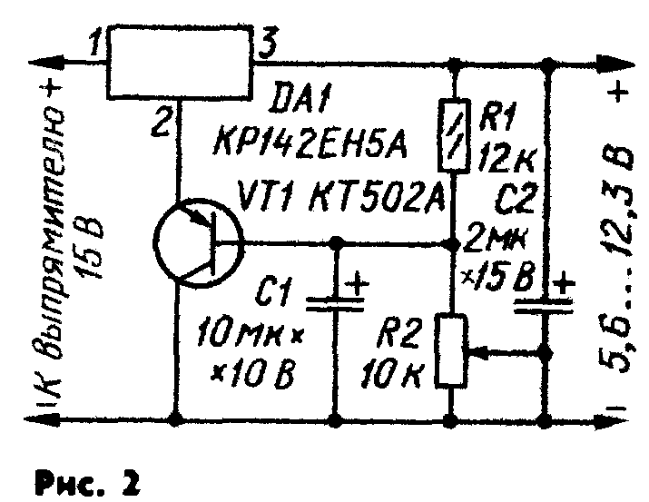 Схема стабилизатора, предлагаемого А. Чумаковым, показана на рис. 1. Переменное напряжение 12,6 В выпрямляет диодный мост VD1. Выпрямленное и сглаженное оксидным конденсатором С1 напряжение стабилизируется стабилитроном VD2 и через переменный резистор R2 подается на вывод 8 стабилизатора К142ЕН5А (DА1). В результате с выхода стабилизатора можно снимать постоянное напряжение от 5 до 15 В, регулируемое резистором R2. Оксидный конденсатор С2 дополнительно сглаживает пульсации выходного напряжения стабилизатора. Вариант включения стабилизатора КР142ЕН5А, предлагаемый А. Черкасовым, показан на рис. 2. На вход стабилизатора DА1 (вывод 1) поступает нестабилизированное напряжение 15 В, а на вывод 2 — сигнал с выхода cтабилизатора, регулируемый переменным резистором R2 и усиленный по току транзистором VТ1.