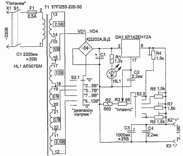 Применение микросхемы КР142ЕН12А (Б) и унифицированного трансформатора ТПП255-220-50 позволяет изготовить простой и надежный источник питания для различных бытовых устройств. Выходное напряжение источника может плавно регулироваться в пределах от 2 до 12 В. Максимальный ток нагрузки 1 А, при этом амплитуда пульсации выходного напряжения не превышает 2 мВ. Блок собран по типовой схеме последовательного компенсационного стабилизатора напряжения. Для того чтобы на микросхеме DA1 не рассеивать слишком большую тепловую мощность, в стабилизаторе предусмотрено дискретное переключение выводов вторичных обмоток трансформатора секцией S2.1 переключателя. Одновременно переключаются и резисторы R4...R7 делителей обратной связи для установки границы регулировки выходного напряжения. На каждом из поддиапазонов нужное напряжение можно устанавливать переменным резистором R3. Переключатель обеспечивает установку диапазонов выходных напряжений 2...5, 5...7, 7...9, 9...12 В. Микросхема DA1 имеет внутреннюю защиту от перегрузки. Индикатором работы источника является светодиод HL1. Для удобства использования схему можно дополнить стрелочным измерительным вольтметром. В конструкции источника питания трансформатор можно заменить более мощным из этой же серии: ТПП276-220-50, ТПП292-220-50, ТПП319-220-50 (нумерация выводов подключения обмоток при этом не меняется, но увеличатся габариты и вес устройства). Микросхема рассчитана на работу с теплоотводом, и ее необходимо закрепить на радиаторе, при этом радиатор не должен иметь электрического контакта с корпусом конструкции. Для удобства настройки границы диапазонов выходных напряжений подстроечные резисторы R4...R7 лучше применить многооборотные, например типа СП5-2 или СП5-14. Конденсаторы применены: С1, СЗ типа К50-29; С2.С4—К73-17.