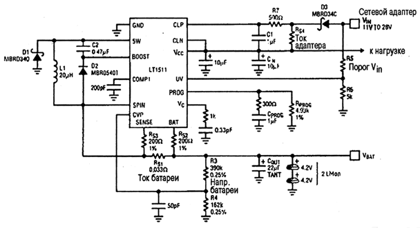 Источник тока на базе высокоэффективного импульсного преобразователя LT1511 разработан с целью применения в зарядных устройствах для аккумуляторов портативной аппаратуры. Зарядное устройство на LT1511 имеет выходную характеристику «стабильное напряжение/стабильный ток», необходимую для заряда литий-ионных батарей. Им можно заряжать и никель-кадмиевые, и никель-металлгидридные (NiMH) батареи, но при использовании внешней цепи функции окончания заряда. Максимальный ток заряда может программироваться как резисторами, так и с помощью ЦАП. Цепь контроля входного тока в LT1511 позволяет одновременно использовать аппаратуру и подзаряжать батареи, не перегружая сетевой адаптер. В таком случае ток заряда автоматически понижается, чтобы поддерживать ток сетевого адаптера на номинальном уровне.