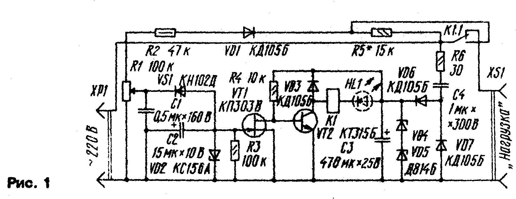 Конденсатор С1 начинает заряжаться и как только напряжение на нем достигнет напряжений пробоя динистора, процесс повторится. При этом конденсатор С2 подзаряжается до напряжения, ограниченного напряжением стабилизации стабилитрона VD2. Но транзистор VT1 в этом случае окажется закрытым, а VT2 - открытым. Сработает реле и контактами К1.1 отключит нагрузку от сети. Если этот режим работы автомата необходимо индицировать, последовательно с обмоткой реле можно включить светодиод HL1 (показан на схеме штриховой линией)—АЛ307Б или аналогичный. Рабочий ток реле не должен превышать прямого тока светодиода, иначе параллельно светодиоду придется включить резистор соответствующего сопротивления. После того как сетевое напряжение уменьшится до допустимого уровня, динистор перестанет открываться, конденсатор С2 за несколько секунд разрядится, транзистор VT1 откроется, а VD2 закроется. Реле обесточится и контактами К1.1 подключит нагрузку к сети.