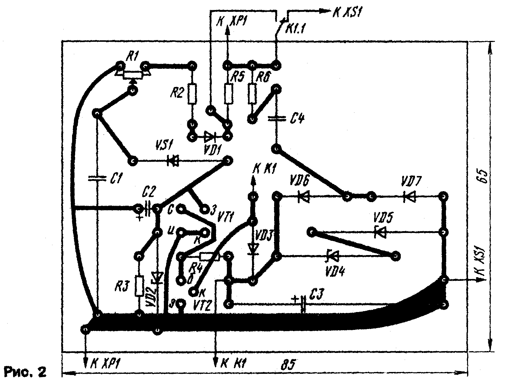 Детали автомата, кроме реле и светодиода (если его решили ввести), размещают на печатной плате (рис.2) из фольгированного стеклотекстолита, Она рассчитана на установку конденсаторов МБМ (С1), К50-24 (С2, СЗ), МБГО (С4), резисторов СПО, СП4 (R1), МЛТ-0,5 (R2), МЛТ-0,125 (остальные). Кроме указанных на схеме, подойдут VD1, VD6, VD7 — Д226Б или аналогичные; VD2 — К6168А, Д814А; VD3 — любой выпрямительный; VD4, VD5 — Д814В—Д814Д; VS1 —КН102Ж, КН102И; VT1 — КПЗОЗГ—КПЗОЗЕ; VT2—КТЗ15В— КТ315И. Реле К1 должно быть с током срабатывания не более 15 мА, в зависимости от его напряжения срабатывания следует выбирать стабилитроны VD4 и VD5. Так, если напряжение срабатывания реле составляет 15В, суммарное напряжение стабилизации стабилитронов должно быть на 5...6 В больше. На такое же напряжение (или большее) должен быть рассчитан конденсатор СЗ. Конечно, контакты реле должны обеспечивать коммутацию подключаемой нагрузки. Автор использовал реле РКМ1 (паспорт РС4.503.835) с включенными последовательно обмотками Можно применить реле и с большим током срабатывания, но в этом случае необходимо увеличить емкость конденсатора С4.