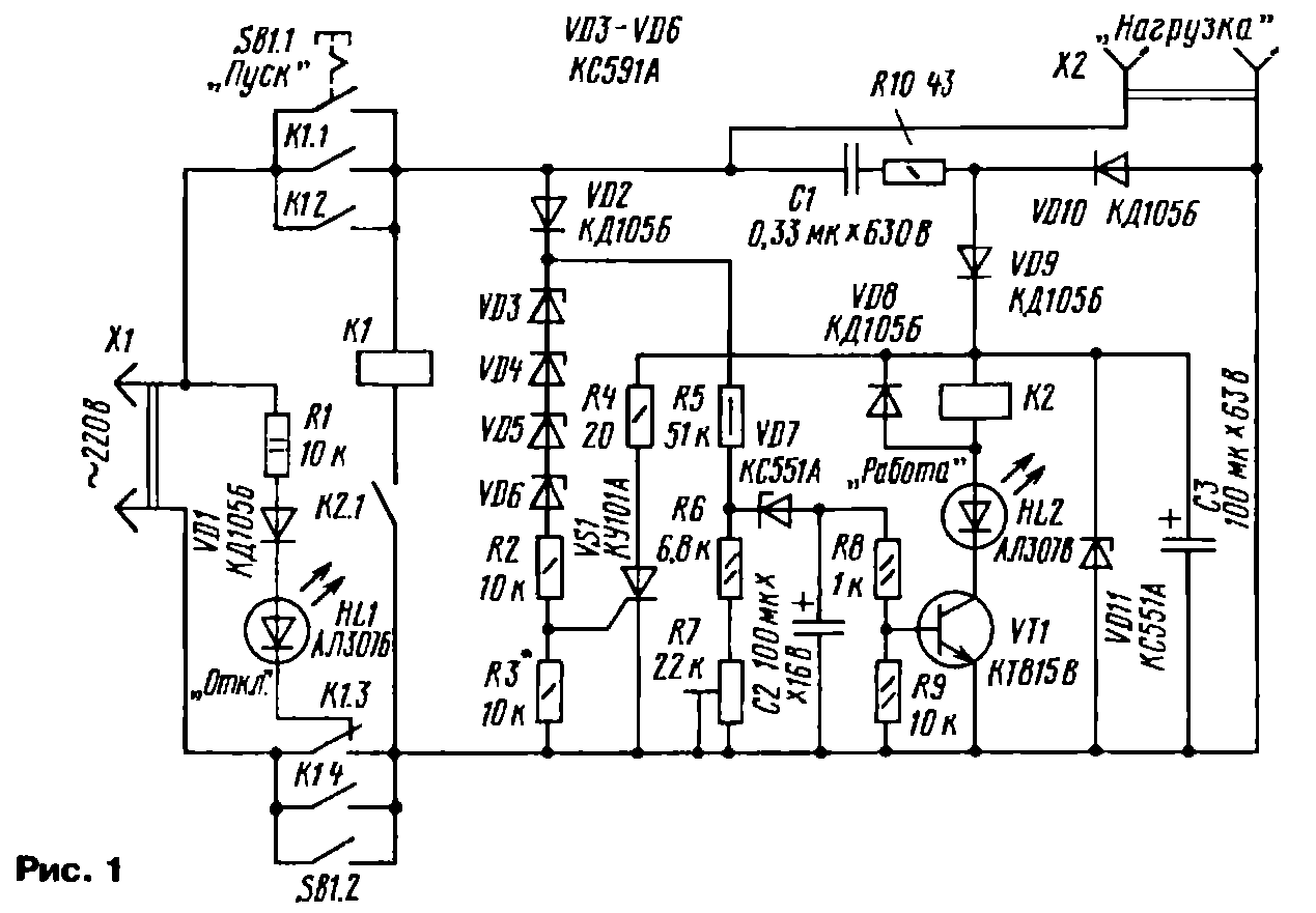 Схема устройства показана на рис. 1. После его подключения к сети все контакты реле К1, кроме К1.3, находятся в разомкнутом состоянии, светодиод HL1 сигнализирует, что нагрузка отключена. Для подключения ее к сети необходимо кратковременно нажать на кнопку SB1 "Пуск". Напряжение, поступающее на устройство защиты через гасящий конденсатор С1, выпрямляется диодами VD9 и VD10, сглаживается конденсатором СЗ и после ограничения стабилитроном VD11 используется для питания реле К2, которое включает более мощное реле К1. Одновременно сетевое напряжение подводится к диоду VD2. Положительные полуволны выпрямленного напряжения поступают на цепочку из стабилитронов VD3 — VD6 и резистивный делитель R5 — R7. Если напряжение в сети будет более 170 В, то поступающее на конденсатор С2 через стабилитрон VD7 напряжение окажется достаточным, чтобы открыть транзистор VT1. В результате сработает реле К2 и его замкнувшиеся контакты подключат реле К1 к сети. Кнопку SB1 при этом отпускают, и устройство переходит в рабочий режим. Светодиод HL1 погаснет, а светодиод HL2 загорится — это сигнал о переходе устройства в режим "Работа". Если же напряжение в сети будет меньше установленного подстроечным резистором R7 уровня, то устройство защиты к сети не подключится. Когда сетевое напряжение превысит допустимый уровень, откроется тринистор VS1. Напряжение, поступающее на реле К2, уменьшится до нескольких вольт, и его разомкнувшиеся контакты отключат устройство защиты и нагрузку от сети. При этом вновь загорится светодиод HL1.