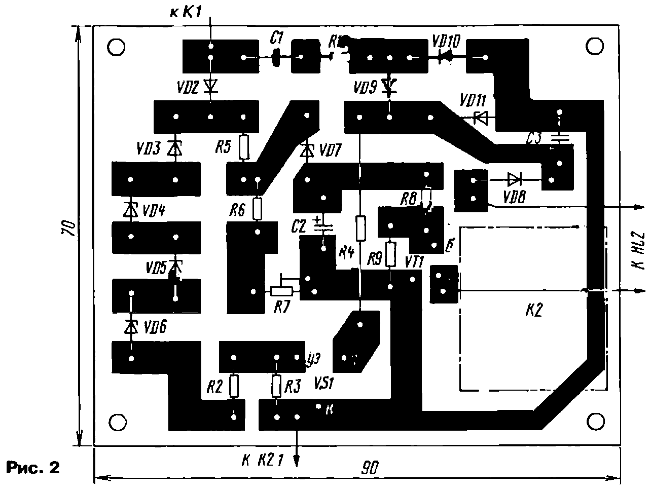 Большинство деталей устройства размещено на печатной плате из одностороннего фольгированного стеклотекстолита толщиной 2 мм (рис. 2). Плата установлена в корпус из изоляционного материала. Там же методом навесного монтажа размещают остальные детали, а также реле К2, если оно имеет большие габариты.