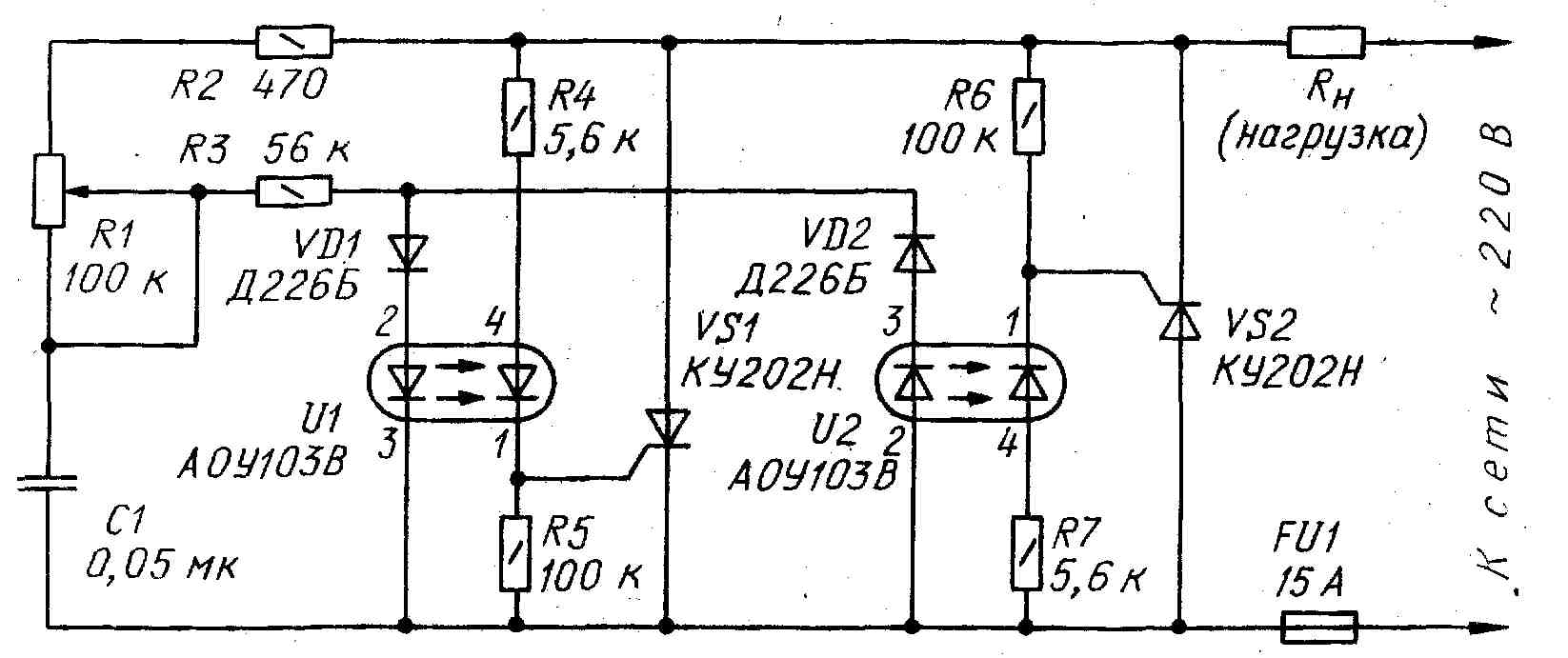 Задача может быть решена применением двух тринисторов — одного для работы на положительной полуволне питающего сетевого напряжения, а другого — на отрицательной. При этом надобность в диодном мосте отпадает (см. схему). Нет необходимости и в формировании коротких импульсов для включения тринисторов, т. к. управляющее напряжение, получаемое из сетевого без выпрямления, представляет собой не последовательность положительных (относительно катода) полуволн, а переменное напряжение, где положительные полуволны чередуются с отрицательными. Цепь R2R1C1 — фазосдвигающая. Поскольку Тринисторы VS1 и VS2 включены встречно-параллельно, их управляющие переходы гальванически развязаны опгронами U1 и U2. В регуляторе можно использовать Тринисторы КУ202 с индексами К^ Л, М, Н. Оптроны желательно применять с индексом В, но как показала практика, нормально работают и оптроны с индексом Б.