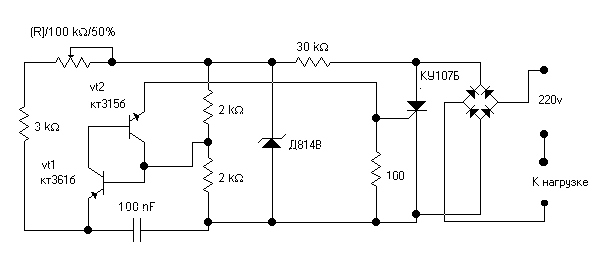 Как работает. Через мостовую схему на диодах ток идет на резистор 30 кОм затем напряжение опустится до напряжения стабилитрона Д814В можно применить любой на 9…12 вольт, дальше напряжение поступает на переменный резистор 100 кОм и 2 кОм первый соединяется 3 кОм и конденсатором 100 nf на этой цепочке образуется на время задерживающая сигнал периудов тока , который подается на эмиттер КТ361б при достижении напряжения более напряжения двух резисторов по 2 кОм транзистор начинает открываться при этом начинает открывать следующий транзистор и тогда ток поступает на тиристор КУ107Б и он открывается . При регулировки переменным резистором регулируется яркость лампы или температура паяльника. Диодную сборку можно применить любую на напряжение не менее 300 вольт и ток в зависимости от нагрузки например (КЦ405А - 400 В, 1 А) или диоды соединенные по мостовой схеме. Тиристор можно заменить на КУ208Г или другой 300 В и ток мощнее диодов раза в два подберите на радио рынке сами вам подскажут. Еще надо чтобы резистор 30 кОм был 2 Вт.