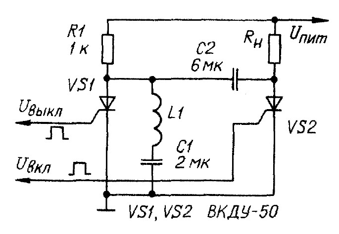 В исходном состоянии тринисторы закрыты, конденсатор С1 заряжен до напряжения питания Uпит. через резистор R1. При поступлении включающего импульса тринистор VS2 открывается, напряжение питания поступает к нагрузке Rн и конденсатор С2 заряжается через резистор R1 до напряжения Uпит.
