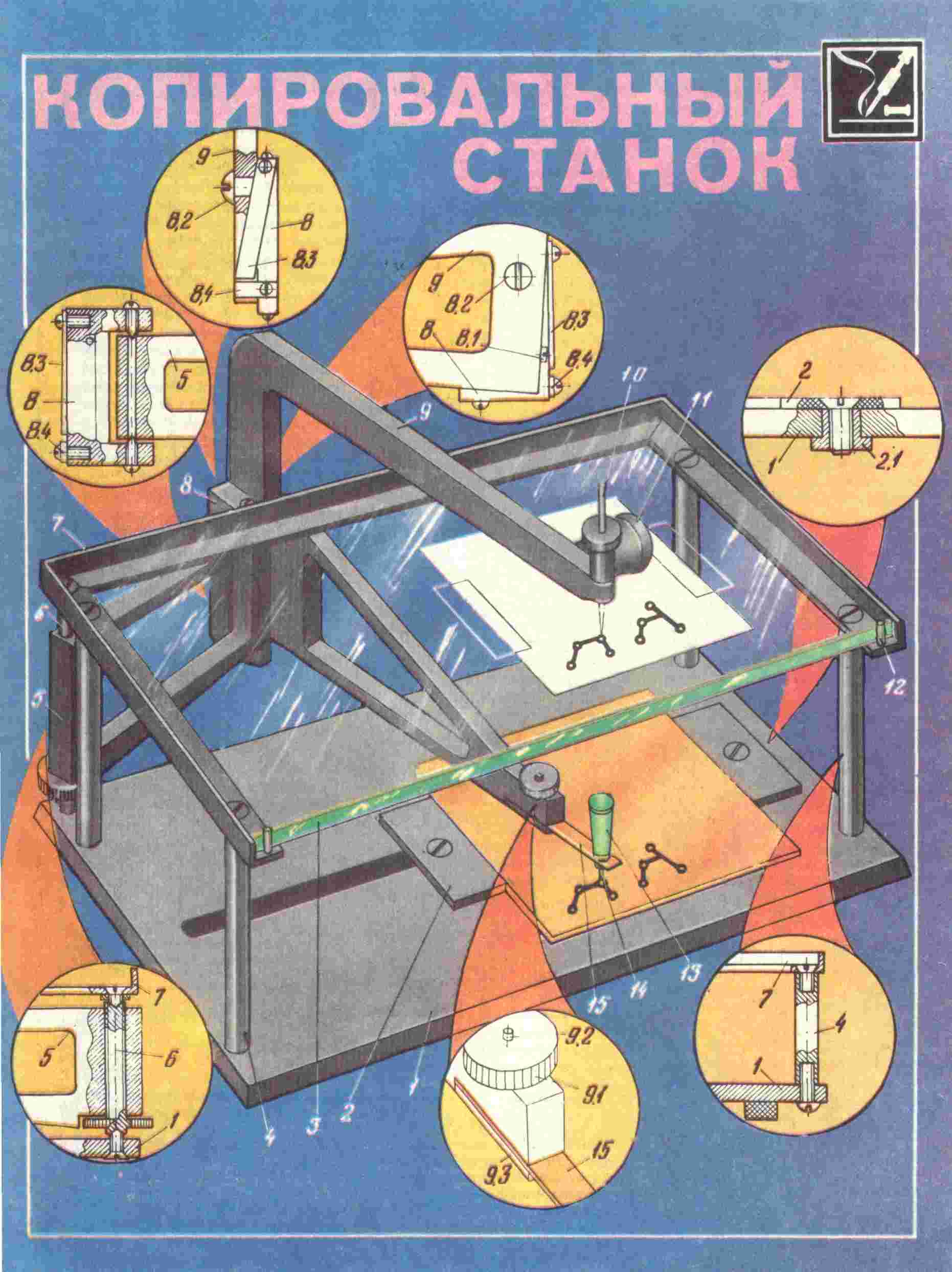 Работу на станке начинают с установки заготовки платы. Для этого снимают стекло стола, заготовку фиксируют зажимами на основании станка, вставляют поводок пера и завинчивают гайку 9.1. Устанавливают на место стекло и опускают водило за ручку 11, при этом оно поворачивается вокруг винта 8.2, преодолевая усилие пружины 8.3. Если перо не доходит до платы, вращают за установочную гайку ось 6 кронштейна до соприкосновения пера с заготовкой и делают еще один оборот для надежного прижима пера. Затем устанавливают на место стекло, на стол накладывают и приклеивают оригинал, после чего устанавливают иглу так, чтобы острие касалось оригинала в нижнем положении водила. Проверяют прилегание пера к заготовке платы по всему ее полю. После этого заполняют воронку пера кислотостойким лаком и, обводя иглой линии на оригинале, следят за рисунком, который выполняет перо на заготовке. Разумеется, результат во многом зависит от того, насколько тщательно подобрана вязкость лака, обезжирена поверхность фольги, обработана рабочая кромка пера и т. д. С помощью станка можно также скопировать рисунок с готовой платы на бумагу или с платы на плату, с бумаги на бумагу. Заменив перо на гравировальное устройство, можно выполнять гравировку на пластинах из мягкого материала.