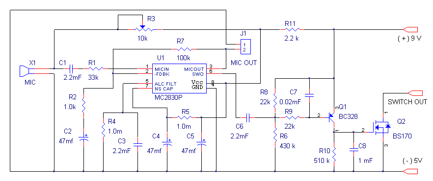 Схема представленная на рисунке выгодно отличается от традиционных подобных устройств, основным недостатком которых является неспособность различить голос и шум. Это приводит к ложным срабатываниям. Эта схема в значительной степени лишена подобных недостатков. В качестве активатора используется микросхема MC2830, далее формированный сигнал поступает на переключатель собранный на транзисторах Q1, Q2. За счет различий в речевых и шумовых формах волны схема срабатывает на голос и не активируется на шум. Чувствительность речевой активации зависит от значения R3 и типа электретного микрофона. Диапазон исполнительных устройств для использования активатора очень широк - от малогабаритных передатчиков в системах контроля до автоматических выключателей освещения.