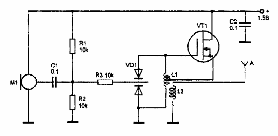 Сверхмаломощного передатчик диапазона 80-100 МГц с частотной модуляцией. Его выходная мощность 0,5 мВт, потребляемый ток не превышает 2 мА. Питание осуществляется от аккумуляторного элемента напряжением 1,5 В. Задающий генератор У KB диапазона выполнен на полевом транзисторе VT1 типа КП313А по схеме индуктивной трехточки с использованием проходной емкости МОП-транзистора. В генератор входят элементы VT1, VD1, L1, L2, С2, R3, а также соединительные и общий провода.