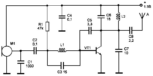 Устройство содержит минимум необходимых деталей и питается от батарейки для электронных часов напряжением 1,5 В. При столь малом напряжении питания и потребляемом токе 2-3 мА сигнал этого радиомикрофона может приниматься на удалении до 150 м. Продолжительность работы около 24 ч. Задающий генератор собран на транзисторе VT1 типа KT368, режим работы которого по постоянному току задается резистором R1. Частота колебаний задается контуром в базовой цепи транзистора VT1. Этот контур включает в себя катушку L1, конденсатор СЗ и емкость цепи база-эмиттер транзистора VT1, в коллекторную цепь которого в качестве нагрузки включен контур, состоящий из катушки L2 и конденсаторов С6, С7. Конденсатор С5 включен в цепь обратной связи и позволяет регулировать уровень возбуждения генератора. В автогенераторах подобного типа частотная модуляция производится путем изменения потенциалов выводов генерирующего элемента. В нашем случае управляющее напряжение прикладывается к базе транзистора VT1, изменяя тем самым напряжение смещения на переходе база-эмиттер и, как следствие, изменяя емкость перехода база-эмиттер. Изменение этой емкости приводит к изменению резонансной частоты колебательного контура, что и приводит к появлению частотной модуляции. При использовании УКВ приемника импортного производства требуемая величина максимальной девиации несущей частоты составляет 75 кГц (для отечественного стандарта - 50 кГц) и получается при изменении напряжения звуковой частоты на базе транзистора в диапазоне 10-100 мВ. Именно поэтому в данной конструкции не используется модулирующий усилитель звуковой частоты. При использовании электретного микрофона с усилителем, например, МКЭ-3, М1-Б2 "Сосна", уровня сигнала, снимаемого непосредственно с выхода микрофона, оказалось достаточно для получения требуемой девиации частоты радиомикрофона. Конденсатор С1 осуществляет фильтрацию колебаний высокой частоты. Конденсатором С7 можно в небольших пределах изменять значение несущей частоты. Сигнал в антенну поступает через конденсатор С8, емкость которого специально выбрана малой для уменьшения влияния возмущающих факторов на частоту колебаний генератора. Антенна сделана из провода или металлического прутка длинной 60-100 см. Длину антенны можно уменьшить, если между ней и конденсатором С8 включить удлинительную катушку L3 (на рис не показана). Катушки радиомикрофона бескаркасные, диаметром 2,5 мм, намотаны виток к витку. Катушка L1 имеет 8 витков, катушка L2 - 6 витков, катушка L3 - 15 витков провода ПЭВ 0,3. При настройке устройства добиваются получения максимального сигнала высокой частоты, изменяя индуктивности катушек L1 и L2. Подбором конденсатора С7 можно немного чить совсем.