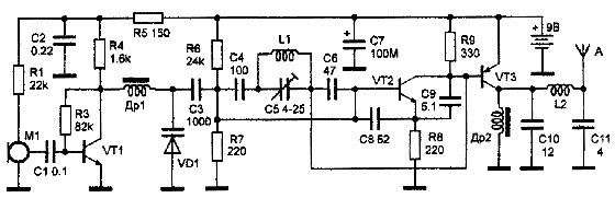 Низкочастотные колебания с выхода микрофона M1 (типа МКЭ-3, М1-Б2 "Сосна" и им подобных) через конденсатор С1 поступают на усилитель звуковой частоты, выполненный на транзисторе VT1 типа КТ315. Усиленный сигнал звуковой частоты, снимаемый с коллектора транзистора VT1, через дроссель Др1 воздействует на варикап VD1 (типа КВ109А), который осуществляет частотную модуляцию радиосигнала, сформированного высокочастотным генератором. Генератор ВЧ собран на транзисторе VT2 типа КТ315. Частота этого генератора зависит от параметров контура L1, С3, С4, С5, С6,VD1. Сигнал ВЧ, снимаемый с коллектора транзистора VT2, усиливается усилителем мощности на транзисторе VT3 типа КТ361. Усилитель мощности имеет гальваническую связь с задающим генератором. Усиленное высокочастотное напряжение выделяется на дросселе Др2 и поступает на П-образный контур, выполненный на элементах С11 L2, С10. Последний настроен на пропускание основного сигнала и подавление множества гармоник, возникающих на коллекторе транзистора VT3. Радиомикрофон собран на плате размером 30х70 мм. В качестве антенны используется отрезок монтажного провода длиной 25 см. Все детали малогабаритные. Резисторы - типа МЛТ-0,125, конденсаторы - К50-35, КМ, КД. Вместо варикапа VD1 типа КВ109А можно использовать варикапы с другим буквенным индексом или варикап типа KB102. Транзисторы могут иметь любой буквенный индекс. Транзисторы VT1 и VT2 можно заменить на КТ3102, КТ368, а транзистор VT3 - на КТ326, КТ3107, КТ363. Дроссели Др1 и Др2 намотаны на резисторах МЛТ 0,25 сопротивлением более 100 кОм проводом ПЭВ 0,1 по 60 витков каждый. Катушки L1 и L2 бескаркасные, диаметром 5 мм. Катушка L1 - 3 витка, катушка L2 - 13 витков провода ПЭВ 0,3.
