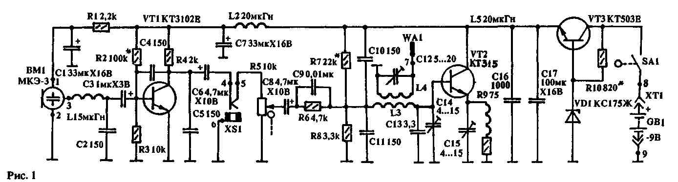 В автогенераторах подобного типа ЧМ чаще всего основываются на изменении параметров колебательного контура или изменении потенциалов выводов генерирующего элемента. В данном случае применяется второй вид ЧМ, т.к. управляющее напряжение приложено к базе транзистора VT2, изменяя тем самым напряжение смещения на переходе база-эмиттер, и, соответственно, емкость цепи Б-3, которая является составной частью колебательного контура генератора (рис.2). Данный контур включает в себя также катушку индуктивности L3, расположенную по ВЧ между базой и массой, и конденсаторы С13—С15. Конденсатор С 15 включен в цепь обратной связи емкостной "трехточки", являясь одним из плеч делителя Сб-э — С15, с которого снимается напряжение ОС. Емкость С15 позволяет регулировать уровень возбуждения и должна составлять примерно 5-8 пф. Для установки оптимального режима работы генератора и получения максимально возможной мощности необходимо правильно выбрать генерирующий элемент. При этом надо учитывать, что его верхняя граничная частота должна не менее чем в 5-6 раз превышать рабочую частоту передатчика. Этому требованию наиболее полно удовлетворяют транзисторы типа КТ355А, КТ372А-В, КТ326, КТ363А,Б, Хотя можно использовать и более распространенные КТ315, КТ339 и др. Применение транзисторов структуры п-р-п более желательно, т.к. они обладают лучшей температурной стабильностью. В генераторе необходимо исключить возможность появления сильной ПАМ. Ослабить ее можно правильным подбором рабочей точки генератора, зависящей от сопротивлений R7—R9. Резисторы R7 и R8 зашунтирова-ны по ВЧ конденсаторами С10 и СИ. Величина сопротивления в цепи эмиттера составляет примерно 68...100 Ом, поэтому во избежание его влияния на колебательный контур, которое может вызвать чрезмерное расширение полосы частот резонансной кривой, последовательно с R9 включен дроссель, блокирующий прохождение токов ВЧ. Раньше существовал специально выделенный для радиомикрофонов диапазон частот 57,5... 58,5 МГц. Но в данной конструкции частота генерации передатчика находится в пределах 66...73 МГц, что позволяет использовать в качестве приемного устройства практически любой промышленный радиоприемник с отечественным УКВ диапазоном, в связи с чем не требуется самому заниматься его изготовлением. Кстати, таким же образом поступают за рубежом при производстве бытовых маломощных радиомикрофонов и средств радиоохранной сигнализации. Например, частота настройки японского радиомикрофона "Orion" равна 100 МГц и может перестраиваться в пределах ±8 МГц (японо-американский широковещательный диапазон УКВ (FM) — 88... 108 МГц). Чтобы избежать возможных помех радиовещательным станциям и, наоборот, помех с их стороны, необходимо выбрать свободный участок УКВ диапазона (емкость его составляет несколько десятков радиоканалов, а используется максимум 4...6). При этом смещение частоты радиомикрофона от ближайшей радиостанции должно быть не менее 250 кГц. Можно перевести работу передатчика на второй радиовещательный диапазон УКВ 100...108 МГц, принятый недавно в отечественном стандарте [2,8]. Этот диапазон пока еще только осваивается, да и то лишь в больших городах (Москва, Санкт-Петербург, Минск), в других местностях он, видимо, еще долго будет оставаться свободным. К тому же во многих импортных радиоприемных устройствах имеется возможность при