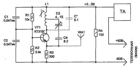 Конденсатор СЗ типа КПКМ, а остальные используемые резисторы и конденсаторы могут быть любого типа, малогабаритные. Катушка L1 наматывается на каркасе диаметром 5 мм проводом ПЭВ 0,23 мм и содержит 5+5 витков. Транзистор КТ315Г можно заменить на КТ3102А, а использовать другие транзисторы не рекомендуется, так как при этом сильно возрастает уровень гармоник, которые могут создавать помехи в других диапазонах. При указанных на схеме деталях уровень второй гармоники передатчика меньше на 40...45 дБ относительно основной частоты. В качестве антенны можно применить отрезок любого многожильного провода длиной 30...40 см. Настройку на нужную частоту, если нет высокочастотного ферритового сердечника, можно выполнить подбором емкости контура, показанного на схеме пунктиром. Конденсаторы С1 и С2 могут иметь номиналы 0,022...0,068 мкФ. Подключение данных схем никак не сказывается на качестве работы телефона.