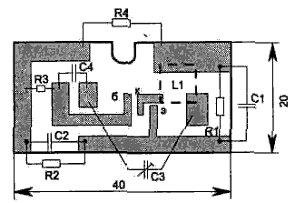 Прослушивается разговор радиоприемником на участке диапазона, где нет радиовещательных станций. Радиус действия передатчика без применения антенны WA1 до 50 м, а для увеличения дальности, кроме применения антенны, необходимо использовать приемник с высокой чувствительностью. Так, увеличение чувствительности приемника в 2 раза на столько же увеличивает дальность приема. При подключении устройства к телефонной линии необходимо соблюдать полярность, указанную на схеме. Настройка схемы заключается в перестройке генератора сердечником катушки L1 на нужную частоту УКВ диапазона, а после этого конденсатором СЗ надо подстроить передатчик, контролируя прием по качеству передачи на слух. Частотная модуляция в передатчике получается за счет изменения внутренней емкости транзистора при колебании напряжения питания схемы за счет протекания тока в линии ТА при разговоре. Перед настройкой передатчика необходимо подключить его к телефонной линии и при снятой трубке замерить напряжение на резисторе R4. Оно должно быть в диапазоне от 2 до 3,5 В, а если напряжение больше, то следует уменьшить сопротивление этого резистора. Схема передатчика собрана на односторонней печатной плате размером 20х40 мм, к контактным площадкам которой припаиваются элементы. Размеры платы позволяют разместить ее в корпусе стандартного телефонного гнезда.