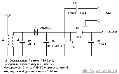 Переменным резистором R1 устанавливается рабочая точка, при которой возникает устойчивая генерация. Частота устанавливается изменением длины катушки и величины емкости С1. Монтаж осуществляется в соответствии с обычными требованиями по конструированию ВЧ-устройств: минимальная длина проводников, экранирование и т. д.