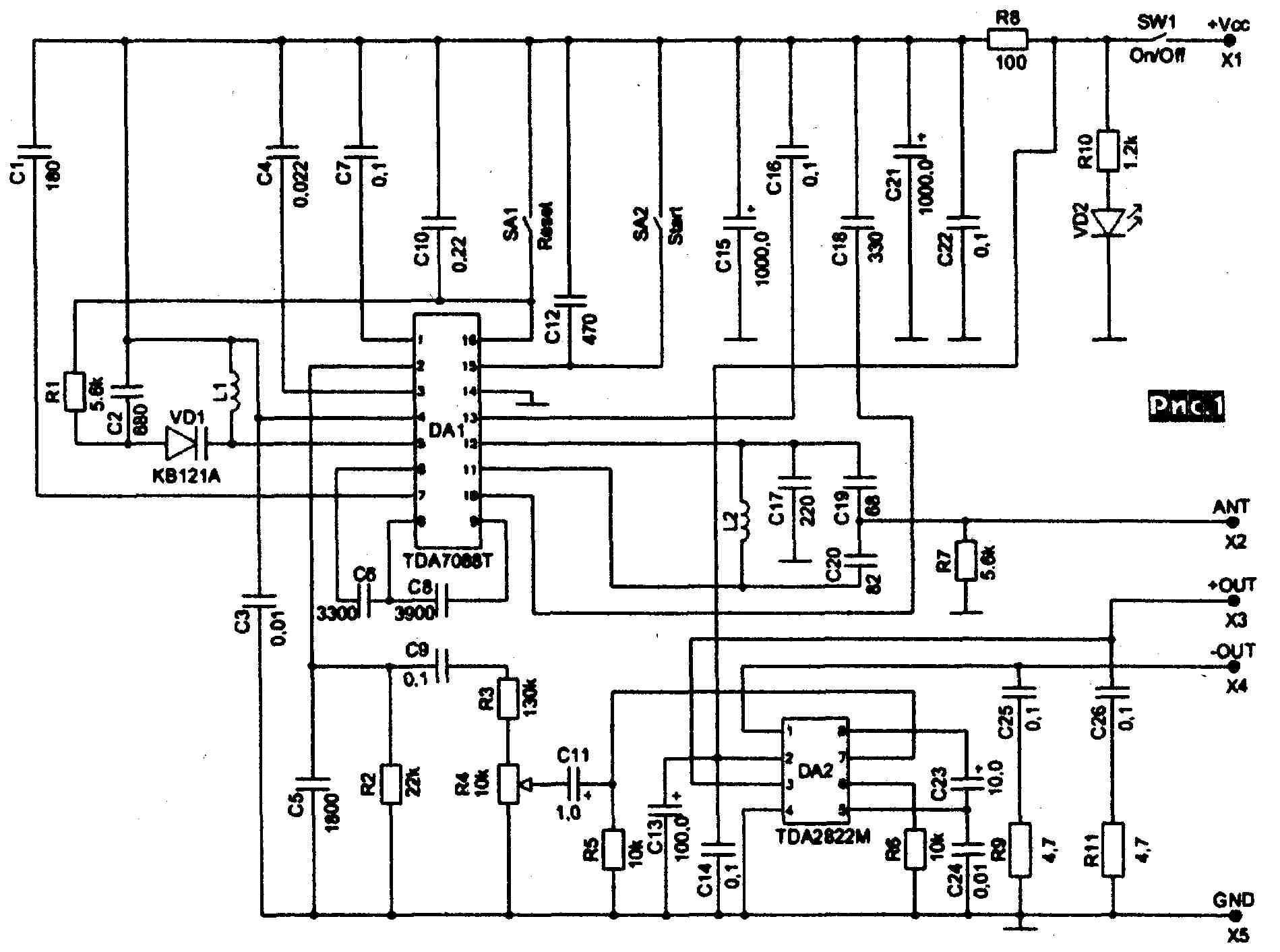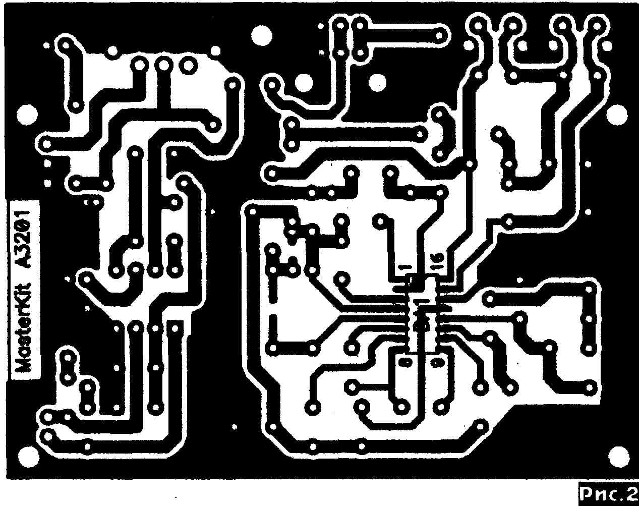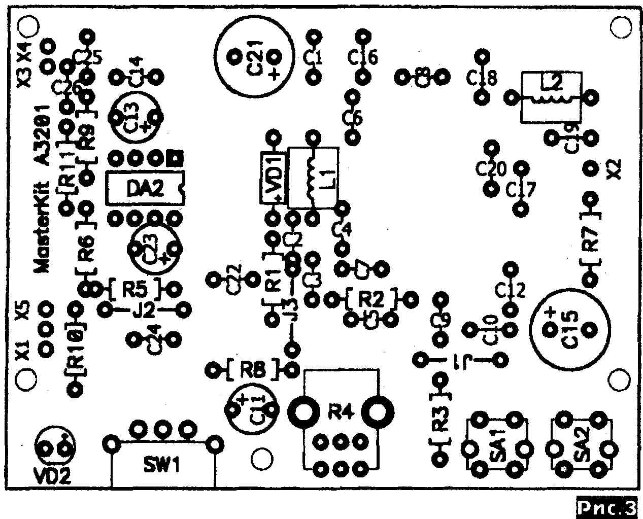 Новый набор «МАСТЕР КИТ» NM3201 представляет собой УКВ приемник (64-108 МГц) с автоматической перестройкой по частоте, низким питающим напряжением и простым управлением. К его особенностям можно отнести отсутствие механических элементов настройки, автоматическое слежение за частотой, возможность осуществления перестройки «вслепую», например, за рулем автомобиля. Принципиальная схема устройства приведена на рис. 1 и состоит из двух конструктивно объединенных частей - УКВ ЧМ тюнера и усилителя низкой частоты (УНЧ). УКВ ЧМ тюнер выполнен на микросхеме TDA7088T (производства фирмы PHILIPS), которая представляет собой монофонический приемник УКВ ЧМ радиовещания от антенного входа до выхода низкой частоты, выполненный в одном кристалле. Вне кристалла остались только перестраиваемый LC-контур гетеродина (L1, С2, VD1), входной LC-контур (L2, С19, С20), органы настройки (SA1, SA2) и управления (SW1, R4), а также небольшое количество внешних фильтрующих RC-цепей. Схема автопоиска ИМС TDA7088T содержит набор узлов, обеспечивающих быструю и точную настройку на радиостанцию, а схема автоматической подстройки частоты гетеродина (АПЧГ) обеспечивает удержание принимаемого сигнала и позволяет уверенно принимать выбранную радиостанцию при изменении уровня сигнала и температуры. При кратковременном отсутствии сигнала в тракте ПЧ, вызванном замираниями входного радиосигнала, состояние настройки сохраняется. Эти особенности делают данное устройство особенно привлекательным с точки зрения получения максимального качества и стабильности приема. Практические измерения параметров приемника на микросхеме TDA7088T показали, что схема АПЧГ успешно восстанавливает настройку приемника при отсутствии радиосигнала на входе в течение 3...5 секунд. Управление режимом автопоиска приемника осуществляется двумя кнопками «Reset» («Сброс») и «Start» («Настройка»). Нажатие на кнопку «Reset», устанавливает настройку приемника на начало диапазона. Каждое нажатие на кнопку «Start» запускает процесс перестройки и переводит настройку на следующую станцию вверх по диапазону. При достижении последней станции в диапазоне приема или для повторной настройки необходимо снова нажать кнопку «Reset», чтобы перейти на начало диапазона. УНЧ выполнен на микросхеме TDA2822 по мостовой схеме. Это позволило при низком напряжении питания получить высокую выходную мощность приемника на стандартном динамике.