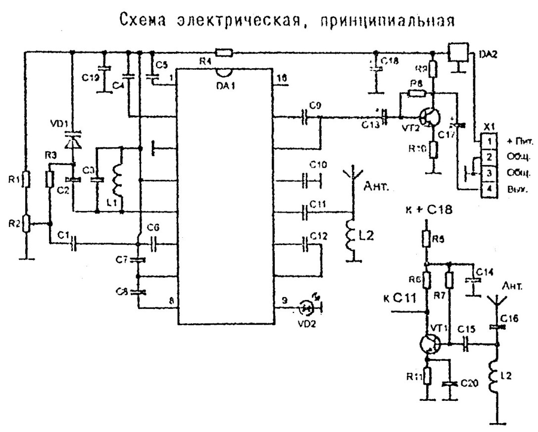 С1 – 0,047 – 0,1 мкФ С2 – 680 пФ – 1500 пФ С3 – 1,5 пФ – 2,2 пФ С4 – 0,1 мкФ С5 – 0,047 мкФ – 0,22 мкФ С6 – 0,1 мкф С7 – 1000 пФ – 1500 пФ С8 – 200 пФ – 360 пФ С9 – 200 пФ – 470 пФ С10 – 2000 пФ – 4700 пФ С11 – 18 пФ – 68 пФ С12 – 3300 пФ – 3900 пФ С13, С17 – 1 мкФ –10 мкФ х 10 В С18 – 10 мкФ – 47 мкФ х 10 В С19 – 0,01 мкФ – 0,1 мкФ DA1 – K174XA34, TDA7021 DA2 – KP142EH5A |