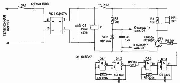 Данное устройство будет полезно тем, у кого в квартире несколько комнат, а телефонный аппарат (ТА) один и его звонок можно не услышать из соседней комнаты или кухни. Наиболее простым выходом из положения может быть подключение параллельно к ТЛ еще одного звонка в другой комнате от старого сломанного телефона. Звонок включается последовательно с конденсатором емкостью 1 мкФ на рабочее напряжение 160 В. Но в этом случае при наборе телефонного номера на телефоне (когда в линию формируются прерывателем импульсы), дополнительный звонок будет позванивать. То же самое будет происходить, если к линии подключены два ТА параллельно.