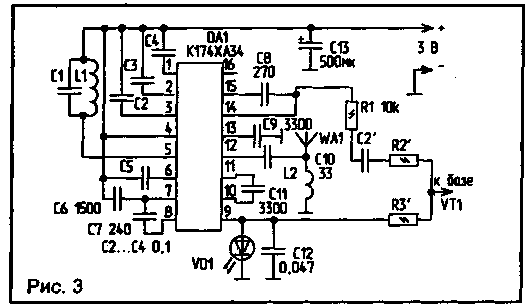 Дальность действия приемника радиотелефонной трубки — ток покоя, так как от него зависит время непрерывной работы. Экономичный приемник с низковольтным питанием можно собрать на микросхеме К174ХА34 по схеме, приведенной на рис.3. При ее отсутствии можно использовать готовый миниатюрный приемник с выходом на телефон. Размеры платы таковы, что позволяют свободно установить ее в трубке радиотелефона. Такой же приемник, но на диапазон 65...74 МГц, можно использовать и для стационарного аппарата. Приемник потребляет небольшой ток, поэтому его можно питать от телефонной линии. Но так как размеры приемника для стационарного аппарата некритичны, для этой цели можно использовать переносной приемник со встроенным блоком питания типа "Океан".