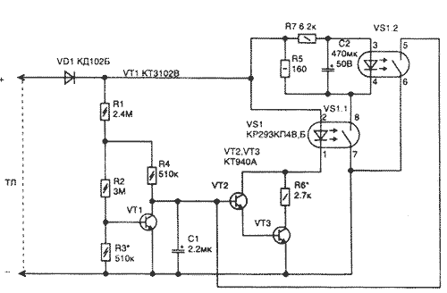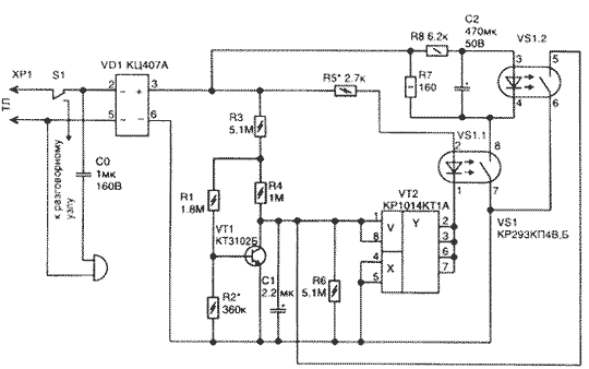 Режим работы VT1 настраивается резистором R2 так, чтобы он при напряжении ниже +18 В запирался. При этом транзистор VT2 током через резисторы R3-R4 откроется, что приведет к срабатыванию оптронного ключа VS1.1. Резистор R7 закоротит телефонную линию, что воспрепятствует импульсному набору номера на время заряда С2. Как только С2 зарядится - сработает ключ VS1.2 и разрядит С1. Этот процесс периодически повторяется, что исключает фиксацию схемы в режиме закорачивания линии после однократного срабатывания блокировки. Конденсатор С1 обеспечивает нечувствительность схемы к сигналу вызова в линии. Устройство подключается параллельно звонку (или схеме звукового сигнализатора) до разделительного конденсатора так, чтобы при поднятии трубки оно отключалось контактами, связанными с положением трубки (S1). В этом случае не потребуется отключать устройство от линии при использовании собственного телефонного аппарата, что удобно при эксплуатации. Схема не критична к выбору типов резисторов и конденсаторов. Вместо диодного моста VD1 можно использовать один диод, но в этом случае при подключении устройства к телефонной линии потребуется соблюдать необходимую для работы полярность.
