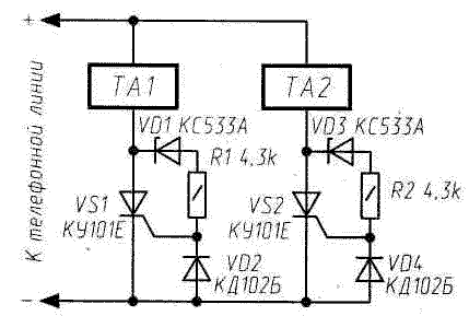 Данное устройство позволяет заблокировать параллельный телефонный аппарат (с него нельзя будет вести разговоры). Ключевую роль играют в этом стабилитроны VD1 и VD3, напряжение стабилизации которых должно быть ниже напряжения, возникающего в свободной телефонной линии, и выше напряжения в занятой линии. Трубка, снятая с аппарата ТА1, открывает стабилитрон VD1 и, соответственно, тиристор VS1, подключая тем самым к сети именно этот телефонный аппарат. Это подключение снижает напряжение в линии с 60 В до 8...15 В и блокирует тем самым работу аппарата ТА2, поскольку такое напряжение будет уже недостаточным для пробоя стабилитрона VD3 и, соответственно, включения тиристора VS2. Диоды VD2 и VD4 - любые кремниевые с обратным напряжением не менее 100 В и прямым током не менее 50 мА - защищают тиристоры от обратного тока через управляющий электрод во время прохождения сигнала вызова. Стабилитроны VD1 и VD3 - любые маломощные с напряжением стабилизации 30...45 В. Такой стабилитрон можно составить из 3-4-х низковольтных стабилитронов.