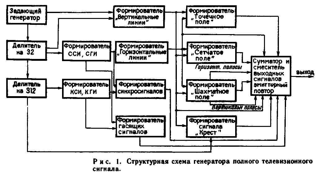 Проверить центровку изображения, линейность разверток, чистоту цвета, качество сведения трех лучей масочного кинескопа цветных телевизоров (и отрегулировать их при необходимости) поможет генератор телевизионных испытательных сигналов (сокращенно ТИС). Он вырабатывает сигналы равномерно светящегося поля, крестовидной фигуры, а также в двух режимах (густо и редко) сигналы вертикальных и горизонтальных линий и полос, сетчатого, точечного и шахматного полей. Отличают данный прибор наличие единственного подборочного элемента — конденсатора в формирователе вертикальных линий, а также временная привязка сигнала «крест» к телевизионному изображению, квадратная форма сигналов ячеек сетчатого, точечного и шахматного полей. В предлагаемой схеме все расчеты выполнены в соответствии со стандартом на вещательное телевидение, поэтому регулировки с помощью этого прибора (центровка растра, установка линейности, горизонтального размера) идентичны настройке по УЭИТ, а отсутствие подборочных элементов обеспечивает нормальную работу генератора после его сборки без сложной наладки, что немаловажно для радиомехаников телеателье и особенно для сельских радиолюбителей. Общие принципы определения координат сигналов изображения на экране телевизора, а также простой способ составления схем сквозных делителей частоты с любым коэффициентом деления изложены в радиолюбительской литературе. Поэтому остановимся лишь на характерных особенностях схемы При воспроизведении изображения широкоугольными цветными кинескопами теряется примерно 6% информации по горизонтали, и потому в простейших генераторах сигналов отпадает необходимость временного сдвига фронта строчного синхроимпульса (ССИ) относительно фронта строчного гасящего импульса (СГИ). Длительность кадровых синхронизирующих (КСИ) и гасящих импульсов (КГИ), а также временной сдвиг между ними — стандартные. Ячейки сигналов сетчатого, точечного и шахматного полей должны иметь форму квадратов для определения горизонтального размера телевизионного изображения. Структурная схема автономного генератора полного телевизионного сигнала приведена на рисунке 1. Принципиальная схема прибора для настройки телевизоров изображена на рис. 2. Задающий генератор собран по типовой схеме на элементах DD1.4, DD1.3 (рис. 2), с кварцевым резонатором в цепи обратной связи. Импульсы частотой 500 кГц через развязывающий элемент DD1.2 поступают на счетчик DD2 с коэффициентом деления 16 и через инвертор DD3.3 на D-триггер DD4. Дешифратор DD5.2 формирует ССИ длительностью 4 мкс, а дешифратор DD6.2 и RS-триггер на элементах DD6.3, DD6.1—СГИ длительностью 12 мкс. В том же триггере происходит сложение гасящих импульсов строк и кадров. Период строчных импульсов 64 мкс (Н). Формирователь импульсов полей с коэффициентом деления 312 состоит из D-триггера DD4.1 — делитель на два, счетчиков DD7, DD8 — делитель на 256, в схему которого введена обратная связь, обеспечивающая модуль пересчета, равный 156 (дешифратор DD5.1 и инвертор DD9.1 вырабатывают импульс сброса). Кадровый синхроимпульс формируется дешифратором DD3.1 и элементом DD15; здесь же происходит сложение синхроимпульсов. Смеситель сигналов выполнен на резисторах R4, R5 и диодах VD2, VD3. Полный видеосигнал с части нагрузки эмиттерного повторителя на транзисторе VT1 поступает на выход. Система цветного 