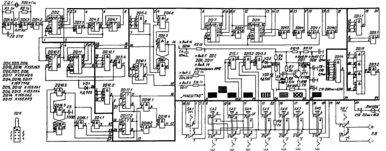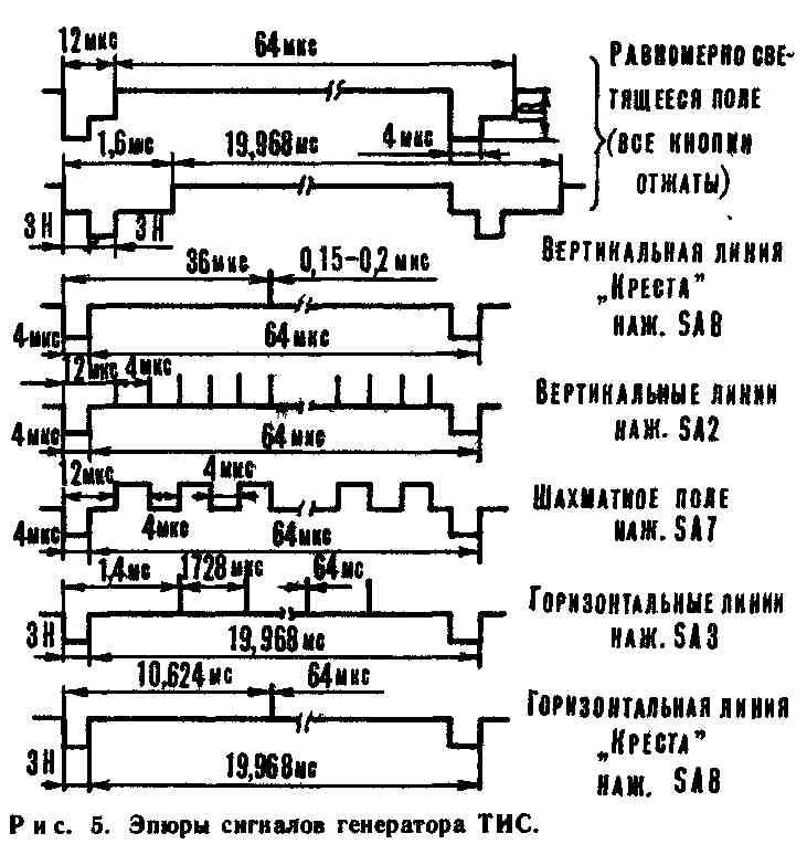 Внешний вид печатной платы — на рис. 4. В генераторе применены микросхемы серии К 155, потребляемый ток составляет 200 мА, при применении микросхем серии К 134 потребление тока снижается до 58 мА, но при этом ухудшается контрастность перехода на границах от черного к белому сигнала вертикальных линий. Для устранения этого недостатка необходимо в задающем генераторе и формирователе вертикальных линий применить микросхему К533ЛАЗ. С целью уменьшения энергопотребления вместо ИМС серии К 155 целесообразно применение микросхем серий К555, К158. Кварцевый резонатор на частоту 500 кГц — вакуумный малогабаритный, резисторы МЛТ-0,25, ВС-0,125, конденсаторы KM, K50-6, переключатель 9-клавишный П2К, разъем типа СР-50-73Ф. Возможно применение и других аналогичных деталей, но при этом возрастут габаритные размеры прибора. Собранный прибор из заведомо исправных деталей не требует настройки и сразу начинает работать. Необходимо только, в зависимости от примененного монтажа, уточнить значение емкости конденсатора СЗ (толщина вертикальной линии должна быть равной толщине горизонтальной линии). Эпюры напряжений на выходе генератора показаны на рисунке 5.
