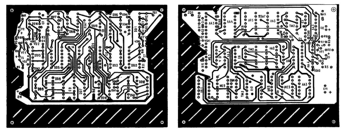 2. С двусторонними печатными проводниками без металлизации отверстий (припайкой выводов микросхем и деталей к проводникам с обеих сторон платы).