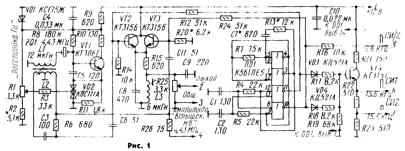Налаживают устройство, используя электронно-счетный частотомер и осциллограф с полосой пропускания не менее 10 МГц, имеющий пробник с входной емкостью не более 15 пФ. Сначала движок переменного резистора R1 устанавливают в среднее положение и подключают вход частотомера между выводами 3 и 4 генератора. Вращая подстроечник катушки L1, добиваются показания частоты 4 433 619 Гц. Далее движок переменного резистора R1 ступенчато перемещают из одного крайнего положения в другое и по частотомеру градуируют его шкалу изменения частоты («Расстройка, Гц»). Затем вход Y осциллографа подсоединяют к выводам 3 и 6 устройства. Подбором резистора R13 в пределах сопротивлений 6,8...30 кОм получают равные соседние интервалы следования импульсов. При этом на выводах 3 и 4 микросхемы DD1 наблюдаются прямоугольные импульсы формы меандр. После этого вход частотомера подключают к выводу 5 устройства и подбором в небольших пределах (±60 пФ) конденсатора С7 устанавливают частоту 7812 Гц колебаний релаксационного генератора на микросхеме DD1. Далее на вход Y осциллографа подают сигналы с выхода (вывод 2) устройства и подбором резистора R20 добиваются равных амплитуд соседних вспышек. Затем настраивают контур L3C9 по максимуму амплитуды вспышек на выходе и, наконец, градуируют шкалу переменного резистора R25 («Амплитуда вспышек, мВ») по осциллографу.