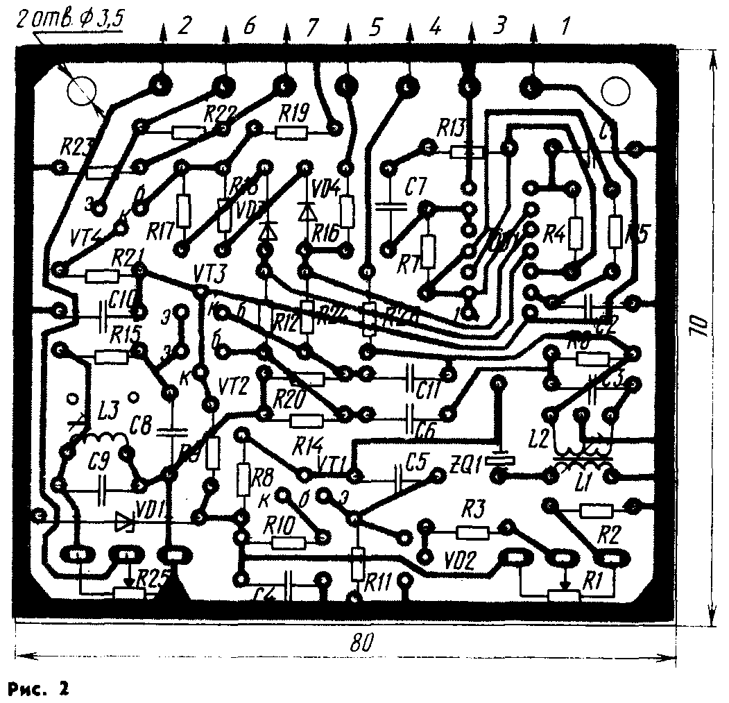 Конструкция и детали. Генератор собран на печатной плате, изображенной на рис 2 и изготовленной из фольгированного стеклотекстолита толщиной 1,5 мм. Все постоянные резисторы — ОМЛТ, переменные — СП3-4аM (установлены на печатной плате), конденсаторы — КТМ или КМ. Стабилитрон КС175Ж (VD1) можно заменить на Д814А, варикапную матрицу КВС111А (VD2) — последовательно включенными конденсатором емкостью 75 пФ (вверху по схеме) и варикапом Д901Г. Все транзисторы можно применить с любыми другими буквенными индексами. Микросхема К561ЛЕ5 может быть заменена на К176ЛЕ5 без изменений на печатной плате. Катушки LI, L2 и L3 намотаны внавал проводом ПЭВ-2 0,12 на каркасах от катушки 2L1 модуля цветности МЦ-2 телевизора ЗУСЦТ. Они снабжены подстроечниками М100НН-2 ПС2,8 х 12. Катушка L1 содержит 95, L2 — две части по 5, a L3 — 25 витков. Катушки L1 и L2 намотаны на одном каркасе, причем L2 размещена поверх L1. Корпусы переменных резисторов R1 и R25 следует соединить с общим проводом.